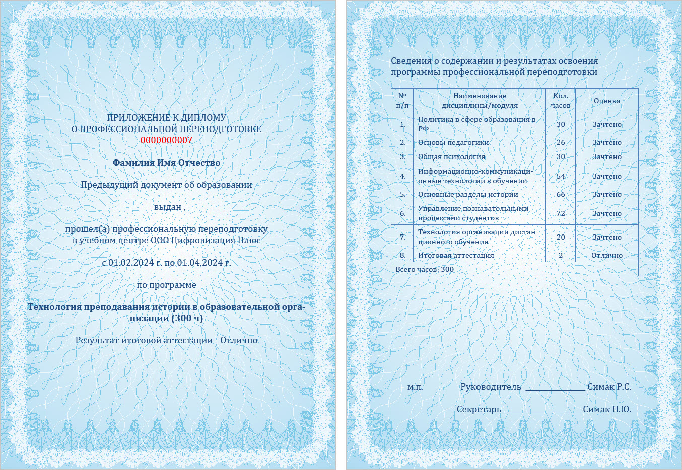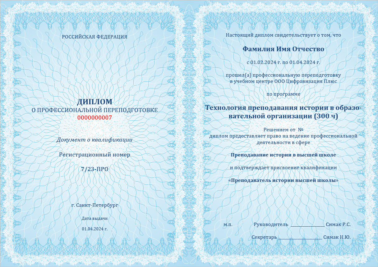 Диплом удостоверяет право на ведение профессиональной деятельности в сфере преподавания истории и подтверждает присвоение квалификации 'Преподаватель истории высшей школы'